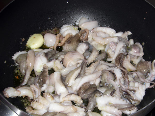 Aggiungiamo i moscardini che abbiamo pulito in precedenza